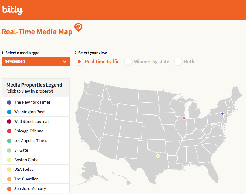 I just happened on the Bitly Media Map when researching their link shortening service to use as an example for thinking through some issues for my research. It is a map of the US that shows by location and in real time the media sources for links that people click on. The effect of the dots lighting up on the map is quite mesmerizing, kind of like a field full of fireflies on a summer evening. It also shows the US waking up. As I type this it is around 9am on the east coast and around 6am on the west coast; most of the activity is happening in the eastern part of the country, with a few early birds up and reading the news on the west coast (mostly around the Bay area).